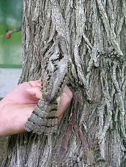 Птица размером приблизительно с сорокопута-жулана: длина тела 17—20 см, размах крыльев 25—30 см, масса 32—48 г[6]. Самец и самка имеют сходную защитную окраску оперения, хорошо скрывающую птиц на фоне древесной коры. Верх пёстрый, серовато-бурый с тёмными продольными пестринами, на спине почти сливающимися в одно большое пятно. Брюхо беловатое с поперечным струйчатым рисунком, как у мелких пернатых хищников. От угла клюва через глаз и далее вдоль шеи проходит отчётливая тёмная полоса, ещё одна такая же полоса тянется через темя и затылок. На горле и груди заметен небольшой желтоватый либо охристый оттенок. Радужная оболочка тёмно-коричневая, клюв и ноги окрашены в тусклый, буровато-роговой цвет. Молодые птицы похожи на взрослых, но имеют более размытый рисунок[6][7][8].