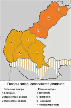 Верхнетре́нчинские го́воры (также верхнетренчинский диалект, севернотренчинские говоры, севернотренчинский диалект; словац. hornotrenčianske nárečia, severotrenčianske nárečia) — говоры западнословацкого диалекта, распространённые в северо-восточной части Тренчинского края и в северо-западной части Жилинского края Словакии[3][4][5]. Согласно классификации словацких диалектов, опубликованной в «Атласе словацкого языка», вернетренчинские говоры вместе с нижнетренчинскими и поважскими входят в группу северных западнословацких говоров[6]. Верхнетренчинский диалектный ареал делится на собственно верхнетренчинские, кисуцкие (нижнекисуцкие) и верхнекисуцкие говоры[7][8]. В некоторых классификациях кисуцкие говоры не включают в состав верхнетренчинского ареала и выделяют как самостоятельный диалектный ареал[9][10].
