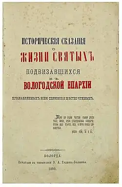 Верюжский. «Исторические сказания о жизни святых, подвизавшихся в Вологодской епархии, прославляемых всею Церковию и местно чтимых». 1880 год