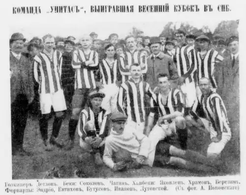 | «Унитас»: [9] Е.Детлов - П.Соколов - Манн, Н.Хромов, Березин - Н.Детлов, Евсиков, В.Бутусов, В.ИвановII, А.ИвановI «Спорт» (III): [10] |
