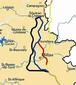 - «Нижний» вариант прохождения трассы — дорога, спускающаяся в равнину и преодолевающая Тарн через мост длиной 600 метров, а затем через виадук до Ларзака длиной 2300 метров, удлинённый туннелем.