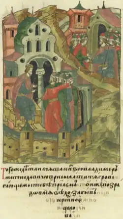 ![]() Совет Владимира Мстиславича Городецкого с митрополитом Климентом и жителями города Киева об измене черниговских князей | |