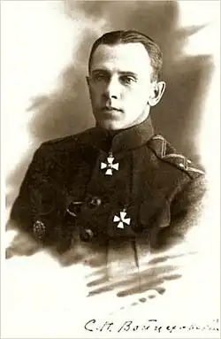- Капитан (16 ноября 1914, старшинство в чине с 10 августа 1913)