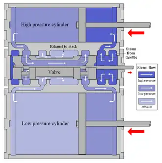 Вверху — цилиндр высокого давления, внизу — цилиндр низкого давления, в центре — золотниковый клапан