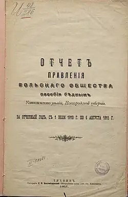 - 1 2 3 «Отчет Правления Вольского общества пособия бедным Устюжского уезда, Новгородской губернии. За отчётный год, с 01 июля 1910 года по 06 августа 1911 года» - г. Тихвин: типография Е.П. Благовещенской, 1911 - 10 с.