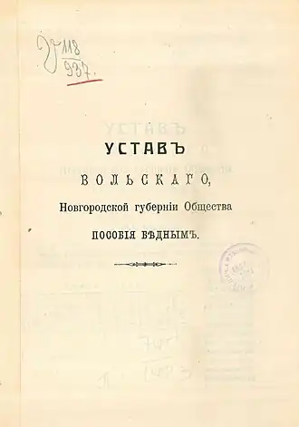 - ↑ «Устав Вольского Новгородской губернии общества пособия бедным» - г. Тихвин: типография Изачик, 1910 - 8 - 9 с.