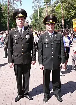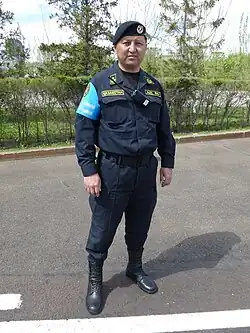 Генерал-лейтенант ВС США Вебстер (Webster) и генерал-майор Алдабергенов в расположении КазБата. 1 октября2009 года.Таджикистанский курсант, обучающийся в Военном институте Сухопутных войск (Алма-Ата). Форма одежды — казахстанская, но кокарда на фуражке и флаг на галстуке — таджикистанские