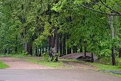 - ↑ Церковь была разрушена в конце 1950-х годов; сохранились лишь остатки трёхъярусной колокольни, мимо которой вёл въезд в усадьбу.