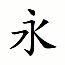 Известно, что у истоков формулировки восьми принципов стоял китайский каллиграф Ван Сичжи. Точное происхождение принципов неизвестно[4], однако существует легенда, по которой в одну ночь после долгого занятия каллиграфией к Ван Сичжи снизошёл старец Байюнь (кит. 白云), который начертал на его руке иероглиф 永, и сказал, что при помощи этого иероглифа возможно довести искусство каллиграфии до совершенства[5]. В древности иероглиф обозначал поток воды, что объясняет схожее начертание с иероглифом 水 "вода"[6].