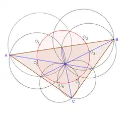 - Три окружности Веррьера касаются описанной окружности вне треугольника.