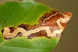 К опасным вредителям бука европейского относится бабочка непарный шелкопряд, гусеницы которой объедают листву и тем самым ослабляют деревья[1]:634—635, хотя массового поражения бука этим вредителем до сих пор отмечено не было[2]:294. Листья бука поедают, скелетируют, минируют, сворачивают в трубки гусеницы краснохвоста, пядениц зимней, обдирало[1]:401, оранжевой (нем. Orangegelber Breitflügelspanner), жёлто-серой (англ. Dotted Border), многих других видов пядениц, в том числе северной буковой пяденицы (нем. Buchen-Frostspanner)[2], стрельчаток пси[3]:390—391, лат. Acronicta auricoma, Acronicta rumicis[1]:401, многих листовёрток, в том числе листовёртки буковой (Isotria hybridana)[3]:274, строфедры буковой (Strophedra weirana)[3]:310, златогузки[1]:401, буковой серпокрылой моли (Ypsolopha parenthesella)[4]:263, буковой весенней моли (нидерл. Voorjaarskortvleugelmot)[4]:297, челночница буковая[3]:403, буковой цельнокрайной хохлатки (англ. Drymonia obliterata) и другими видами хохлаток[1]:401, вилохвоста букового[2]:274—277[3]:339, буковой минирующей (Lithocolletis cramerella)[3]:243, дубовой моли-пестрянки (Gracilaria alchimiella)[3]:236. Некоторые из них повреждают также почки, бутоны и молодые листочки бука. Повреждают почки бука гусеницы чехлоноски Postvinculia lutepennalla[2]:106. Гусеницы зелёно-бурой листовёртки (Syricoris lacunana) вредят сеянцам и молодой поросли бука[4]. Вспышки массового размножения краснохвоста наблюдались на обширной территории в несколько тысяч га от Бельгии, Нидерландов, Франции через Германию до Польши, Болгарии, Украины и России, охватывая лиственные леса и посадки молодых растений из семейств буковых, берёзовых, розоцветных и ивовых. Деревья при этом оголялись или подвергались сильной дефолиации[2]:280—281. Личинки различных видов долгоносиков повреждают листья и почки бука, среди них долгоносик буковый листовой[3]:114.