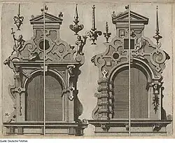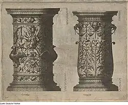 В гравюрах к трактату «Разные архитектурные формы» Вредеман де Врис показал композиции, полные немыслимой архитектуры с перспективами улиц, нагромождениями арок, колоннад, балюстрад, фонтанов… Их стиль — соединение итальянского маньеризма и фламандского барокко — отличается сумбуром архитектурного декора различных ордеров, пышностью орнамента бандельверк, вероятно под влиянием Корнелиса Флориса, причудливостью перспективных построений, дробностью формы[8]