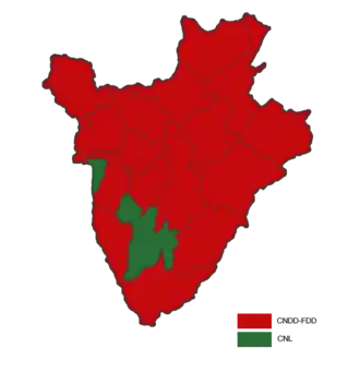 Правящая НСОД-СОД победила в 16 округах, в двух (Бужумбура-Мери и Бурури) победил НКС.