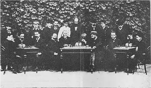 Слева направо (сидят): А. К. Рубинштейн, М. Венгеров, Г. С. Сальве, М. И. Чигорин, М. Лохтин, …, В. Н. Юревич, О. С. Бернштейн, Э. С. Шифферс, Ф. И. Дуз-Хотимирский