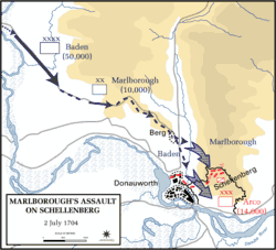 Союзникам нужна была база для провизии и хорошая переправа через реку. Следовательно, 2 июля Мальборо штурмовал крепость Шелленберг на высотах над городом Донаувёрт. Граф Жан д'Арко был отправлен с 12 000 человек из франко-баварского лагеря, чтобы удерживать город и покрытый травой холм, но после ожесточённого боя с тяжёлыми потерями с обеих сторон Шелленберг пал. Это вынудило Донаувёрт вскоре после этого сдаться. Максимилиан, зная, что его позиция в Диллингене теперь ненадёжна, занял позицию за сильными укреплениями Аугсбурга..[23]