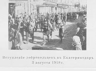 Немаловажным обстоятельством было и то, что половину личного состава армии составляли кубанские казаки, присоединившиеся к добровольцам в надежде, что те освободят сначала их край, а потом уже остальную Россию. Да и вообще, Северный Кавказ представлялся более надежной базой, чем Поволжье, политические симпатии которого были неизвестны.
