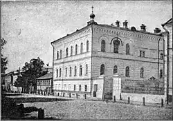 Первоначально каменное трёхэтажное здание, построенное на месте левого флигеля усадьбы, имело пять окон по главному уличному фасаду. По центру западного фасада к нему примыкал небольшой объём трёхэтажного пристроя с арочным проездом в первом этаже. По проекту 1871 года здание было дополнено небольшой звонницей над крышей, поскольку на третьем этаже находилась домовая церковь во имя святого благоверного князя Александра Невского, устроенная в 1867 году. Надзор за работами проводил Р. Я. Килевейн[1].
