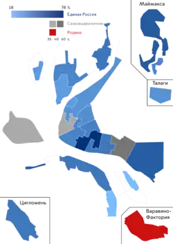 В 12 из 15 одномандатных округов победил кандидат от Единой России. В 5 и 10 округах победили кандидаты-самовыдвиженцы, а в 3 — кандидат от Родины.