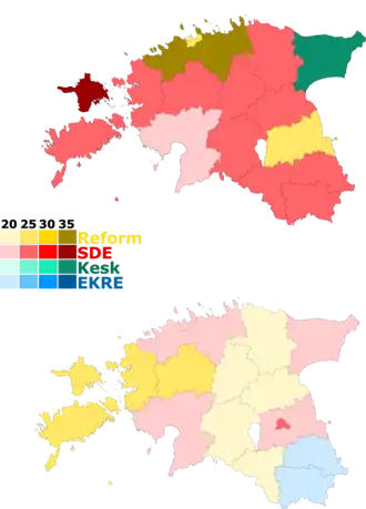 | Партия реформ Эстонии (RE) | 87 160 | 26,2 % | +1,9 % | 2 | ±0 | |