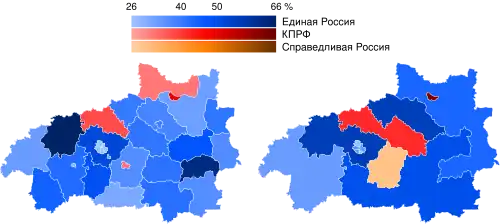 ![]() Результаты выборов в едином округе по территориальным избирательным комиссиям (слева) и одномандатных округах (справа) | |||