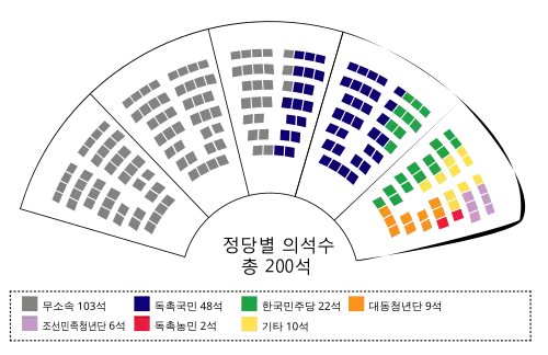 Выборы состоялись 10 мая, на них было избрано 200 членов Конституционной ассамблеи, которая 17 июля приняла конституцию Первой республики Южная Корея, а 20 июля избрала президента, где из 200 голосов 180 было отдано за кандидатуру Ли Сынмана[11].