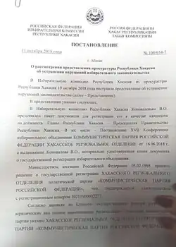 - ↑ Ведомости (11 октября 2018). Избирком Хакасии попросит суд отменить регистрацию кандидата от КПРФ. Архивировано 11 октября 2018. Дата обращения: 11 октября 2018.