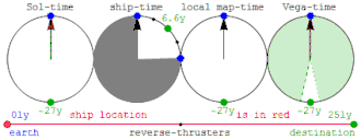 В системе же отсчёта импульс света излучается из начала координат в момент его совпадения с началом координат системы (точкой A), а попадает в приёмник B через время , которое измеряется часами, движущимися вместе с системой . Координата точки B — смещение, обозначенное на правой диаграмме на рисунке пунктиром, равно , точка A указывает место, откуда был излучён импульс, траектория импульса в изображена зеленой линией.