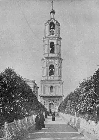 В 1894 году у колокольни был надстроен пятый ярус. Таким образом высота колокольни увеличилась до 68 метров. Всего на ней было установлено 18 колоколов общим весом более 32 тонн. Вес самого большого из них составлял 17630 кг. В верхнем ярусе помещались часы со звоном, игравшие каждые 15 минут мелодию «Кто тя может избежать, смертный час». На южном и северном фасадах первого яруса размещались три ряда икон жития Богоматери, написанных на цинковых листах[12][13].