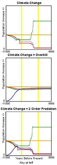 Результаты математического моделирования истории климатических изменений и истории заселения планеты людьми показали, что в 20 % случаев вымирания мог преобладать климатический фактор, в 64 % случаев большее совпадение с процессом вымирания показали модели, базирующиеся на истории заселения людьми[9].