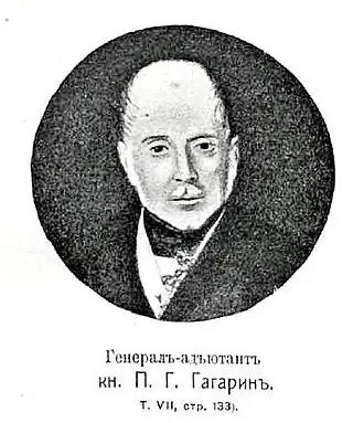 - ↑ Гагарин, Павел Гаврилович, князь // Военная энциклопедия : [в 18 т.] / под ред. В. Ф. Новицкого … [и др.]. — СПб. ; [М.] : Тип. т-ва И. Д. Сытина, 1911—1915.