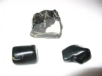 Однородный, плотный, вязкий, с интенсивно-жирным смолистым блеском материал. Цвет камня чёрный или коричнево-чёрный.