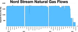 В начале сентября «Газпром» заявил о приостановке поставок по «Северному потоку» из-за технических неисправностей, проиллюстрированных фотографиями подтёков масла и повреждённой оплётки кабелей. Siemens как производитель этого оборудования счёл решение необоснованным, но для российского руководство оно стало удобным предлогом для окончательного отключения газопровода[4]. Газовый рынок не отреагировал: на фоне новостей о росте импорта СПГ, заполнении подземных газовых хранилищ, запуске угольных электростанций, строительстве терминалов для СПГ газ за последующую неделю подешевел на треть (а вместе с ним и электричество)[6]. После отключения «Северного потока — 1» российские власти настаивали на запуске «Северного потока — 2», который за 2014—2021 год приобрёл символическое значение. Однако европейская сторона отказалась от этого[2]. В конце сентября 2022 серия взрывов разрушила почти все ветки «Северных потоков». Западные государства обвинили Россию в организации диверсии[7], Владимир Путин возложил ответственность на «англосаксов»[8].