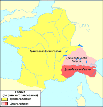 • Трансальпийская Галлия (лат. Gallia Transalpina), то есть «Галлия, расположенная за Альпами» — часть Галлии, ограниченная Средиземным морем, Пиренеями, Атлантическим океаном, Ла-Маншем, Рейном и Альпами. Другое название — Дальняя Галлия (лат. Gallia Ulterior).