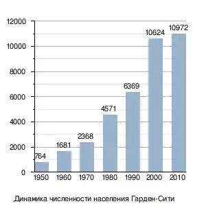 По данным переписи 2010 года, население Гарден-Сити составляло 10 972 человека. Плотность населения равна 1015 чел./км². Средний возраст населения — 43 года и 2 месяца[5]. Половой состав населения: 48,4 % — мужчины, 51,6 % — женщины. Расовый состав населения по данным на 2010 год[6]: