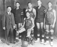 «Гарлем Глобтроттерс», ок. 1930 года. Стоят слева направо: Эйб Саперстейн, Уолтер (Тутс) Райт, Байрон (Фэт) Лонг, Инман Джексон, Уильям (Кид) Оливер; сидит — Рант Пуллинз