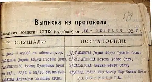 В конце концов, следователи Васин, Жуков и Назаров, представили свое заключение от 31 декабря 1926 года по делу Д. Гасанова, в котором написали, что в связи с его неисправимостью и упорством он должен быть расстрелян. С этим заключением согласился Зампред ГПУ Горобченко и утвердил председатель АзГПУ М. Д. Багиров.[1]