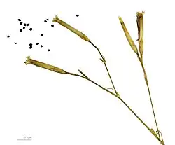 Слева направо — Цветок гвоздики пышной и некоторых ранее выделявшихся подвидов: Dianthus superbus subsp. longicalycinus, Dianthus superbus subsp. alpestris, Dianthus superbus var. speciosus; плоды и семена | ||||||||||