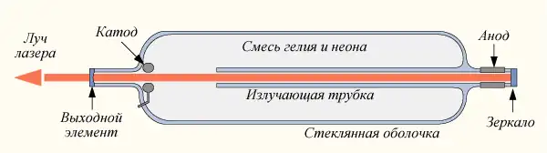Рабочим телом гелий-неонового лазера служит смесь гелия и неона в пропорции 5:1, находящаяся в стеклянной колбе под низким давлением (обычно около 300 Па). Энергия накачки подаётся от двух электрических разрядников с напряжением около 1000—5000 вольт (в зависимости от длины трубки), расположенных в торцах колбы. Резонатор такого лазера обычно состоит из двух зеркал — полностью непрозрачного с одной стороны колбы и второго, пропускающего через себя около 1 % падающего излучения на выходной стороне устройства.