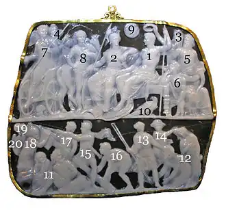 Персонаж № 4 — богиня победы, Виктория. Она управляет колесницей, с которой спускается персонаж № 7. Персонаж № 7 — это, предположительно, Тиберий, преемник Августа. Персонаж № 8 идентифицируется как Германик, любимый племянник императора.