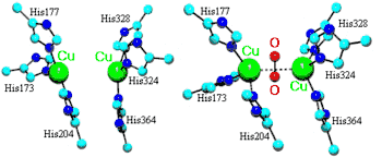 В неокисленной форме катионы меди находятся в степени окисления +1, отстоят друг от друга на расстояние 4,6 Å, химическое связывание между ними отсутствует. Конфигурация N—Cu—N близка к треугольной, расстояния Cu—N находятся в пределах 1,9—2,1 Å. При оксигенации ионы меди приобретают степень окисления +2. Катионы меди сближаются друг с другом и расстояние Cu—Cu составляет 3,6 Å, а расстояния Cu—O — 1,8—1,9 Å. В результате сближения ионов меди углы N—Cu—N приближаются к тетраэдрическим. Кроме того, связи Cu—N становятся неравными по длине: в окружении каждого иона две связи имеют длину 1,9—2,0 Å, а третья связь удлиняется до 2,3 Å[14].