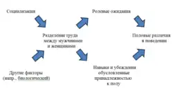 Элис Игли (Alice Eagly) в своей книге «Межполовые различия в социальном поведении» представляет теорию, в которой описывается механизм взаимодействия культуры и биологии[6].