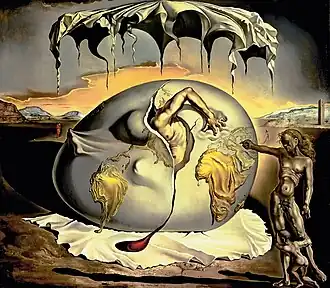 Яйцо — традиционный мотив в творчестве Дали. В его ранние периоды оно обычно символизировали надежду и любовь. Однако в картине «Геополитический ребёнок, наблюдающий за рождением нового человека» и другими более поздними работами, яйцо предстаёт в качестве христианского символа чистоты и совершенства[4]. Дали использует вытекающий жёлтый «желток» этого яйца для изображения карты Земли[3].