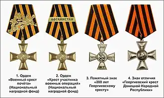 29 мая 2014 года в Донецкой Народной Республике были учреждены собственные Георгиевские кресты. Они имели четыре степени и внешне идентичны российским, отличались лишь надписью «ДНР» на реверсе креста. Так же в отдельных добровольческих подразделениях ДНР были отмечены случаи награждения крестами, отличающимися от государственных крестов ДНР отсутствием степеней и внешним видом — наличием выпуклых букв «Д» «Н» «Р» по концам креста на аверсе. Награждения такими крестами можно приравнять к общественным.