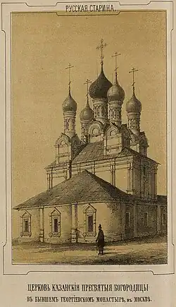 После воцарения в 1613 году Романовых благополучие их родового монастыря расцвело. Примерно в 1670-е годы в Георгиевском монастыре появилась вторая церковь (отапливаемая) по благословению патриарха Московского Иоакима. Средства поступили от боярина Родиона Матвеевича Стрешнева. Был возведен 5-главый храм в честь Казанской иконы Божией Матери. Храм представлял собой прямоугольный в плане, вытянутый с севера на юг, 5-главый 2-светный четверик с выступающими 3 полукружиями апсид; с запада к нему примыкала трапезная. Кровлю венчало необычное 5-главие: луковичные главки на барабанах стояли на массивных квадратных постаментах, которые завершались кокошниками; основание центральной главы располагалось выше остальных.