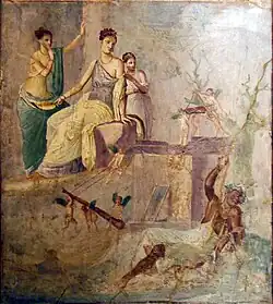 Третьим подвигом Геракла Псевдо-Аполлодор называет поимку керинейской лани (по словам остальных мифографов, этот подвиг стал четвёртым)[49]. Лань, посвященная Артемиде, отличалась удивительной быстротой; у неё были золотые рога и медные копыта. На этот раз задача Геракла оказалась особенно сложной, поскольку Еврисфей хотел получить зверя живым. Целый год герой преследовал лань, дойдя в своих странствиях до страны гипербореев на далёком севере; наконец, он настиг её на границе Арголиды и Аркадии. О поимке животного античные авторы рассказывают по-разному: Геракл либо поймал её сетью, либо застал спящей под деревом, либо истощил непрерывной погоней[66], либо ранил стрелой в передние ноги, так что она не смогла бежать дальше, но не потеряла ни капли крови[67][68][69].