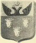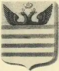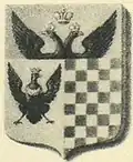 Щит, у коего верхняя часть одинаковая с предъидущим гербом [то есть вверху выходящий двуглавый орёл], а в нижней, серебряной, изображен чёрный ворон[3] |