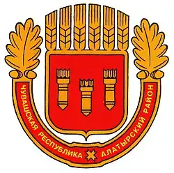 В червлёном щите герб 1778 года[3] (три золотых колчана, в знак того, что сих мест жители сие оружие с похвалой употреблять умели). Герб увенчан золотыми стилизованными хлебными колосьями и обрамлён пурпуровой окаймлённой золотом лентой с надписью золотом «Чувашская Республика — Алатырский район», оканчивающейся золотыми дубовыми листьями.