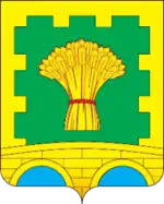 В зелёном поле c золотой стеннозубчатой каймой — хлебный сноп того же металла, перевязанный червленью, сопровождаемый в оконечности, поверх каймы золотым мурованным мостом о двух арках, заполненных лазурью.