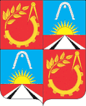 В лазоревом поле выходящее золотое сияющее солнце (без изображения лица), сопровождаемое во главе щита серебряной конской дугой с колокольчиком того же металла. Червлёная оконечность обременена серебряным вписанным острием, имеющим вдоль боковых сторон сужающуюся кверху и доходящую до конца острия чёрную внутреннюю кайму