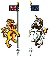 Поддерживают щит стоящие на задних лапах английский лев и шотландский единорог (фигуры заимствованы из герба Великобритании). Лев и единорог держат флагштоки с королевскими знамёнами Британии и Франции. В отличие от Британской версии, лев не коронованный и смотрит в сторону. Разорванная цепь символизирует сопротивление единорога против притеснения[31].
